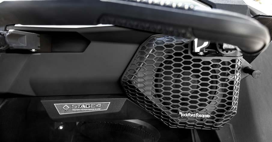 Sistema de Audio Rockford Fosgate Stage 4 integrado y afinado de fábrica con RIDE COMMAND. Incluye (2) tweeters de 1" de 100 W, (2) bocinas delanteras de 6.5" de 100 W, (2) bocinas traseras coaxiales de 6.5"" de 100 W, (1) amplificador de 4 canales de 400 W y (1) subwoofer de 10" con un amplificador integrado de 400 W. *El sistema de audio está probado en inmersión en agua IPX7 e IPX9K para soportar elementos húmedos.